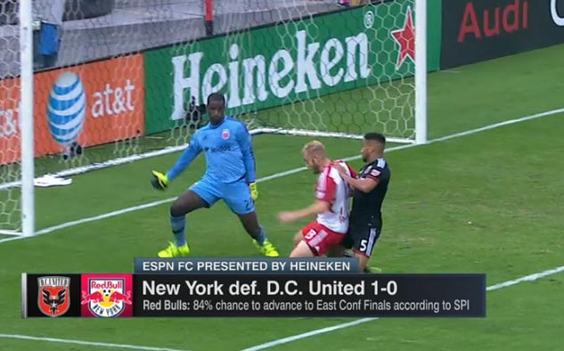 La cobertura de la Major League Soccer (MLS) a través de redes de ESPN en América Latina, Brasil, el Caribe, Australia, Nueva Zelanda y las islas del Pacífico; continuó con la presentación en vivo de las semifinales de la Conferencia, que comenzó este domingo 1° de noviembre con una doble cartelera en exclusiva a las 3 pm. ET entre D.C. United y New York Red Bulls, seguido por Portland Timbers vs. Vancouver Whitecaps.